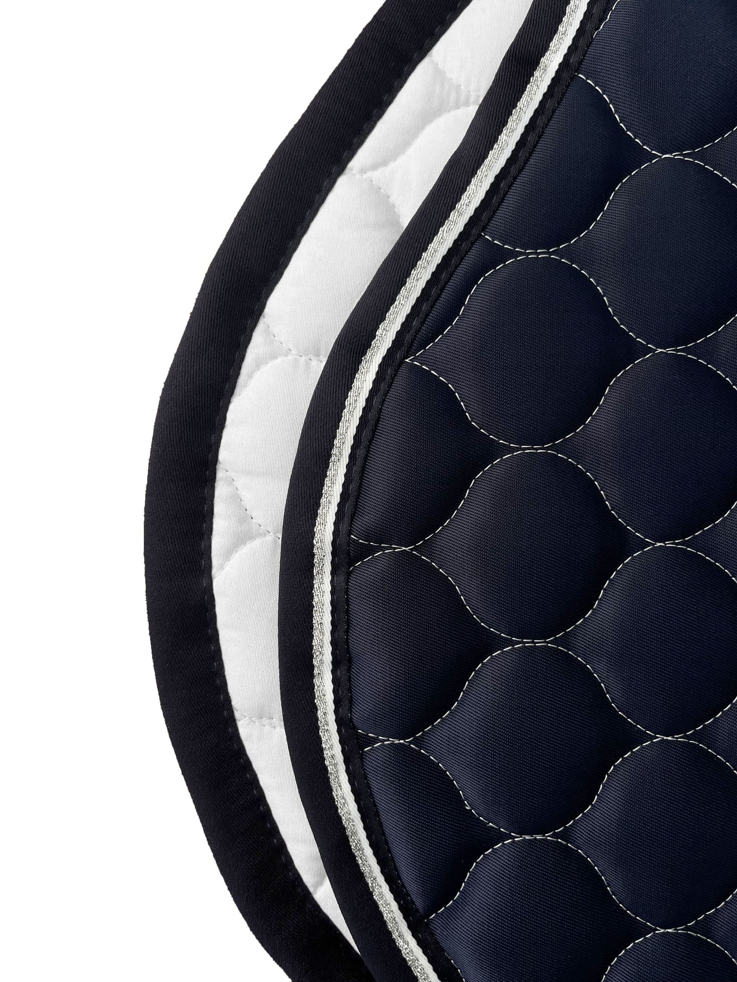 The Caballo Negro jumping saddlepad is a tribute to elegance and uniqueness. The outer satin fabric subtly shimmers in the sunlight, while the stone embroidered frenulum motif adds a touch of glamour. The anatomical line of the back ensures an optimal fit of the saddlepad, and the breathable material perfectly wicks away sweat.