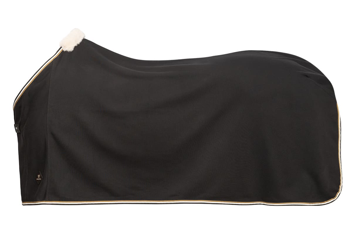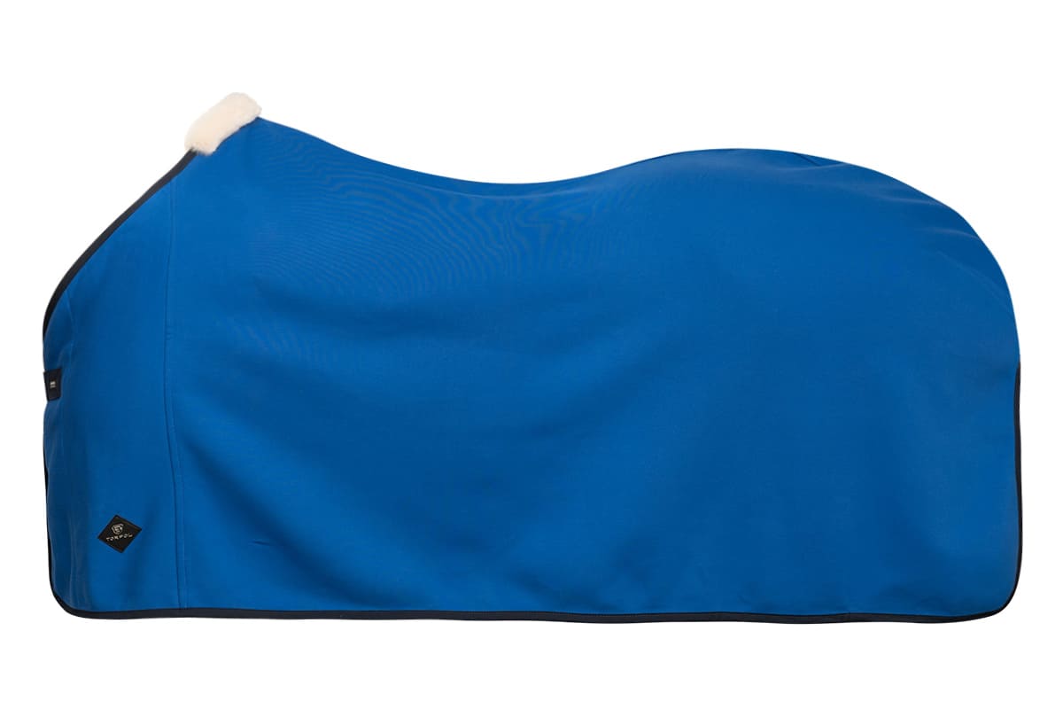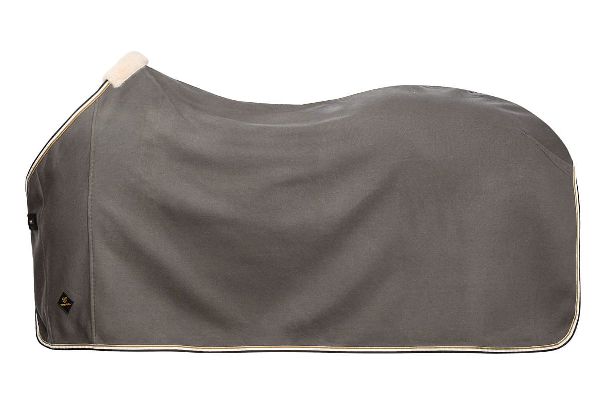 A multifunctional rug made from soft cotton knit fabric. Finished with a contrasting trim. Soft fleece along the spine protects the withers from chafing. Features a single front buckle and a tail cord.