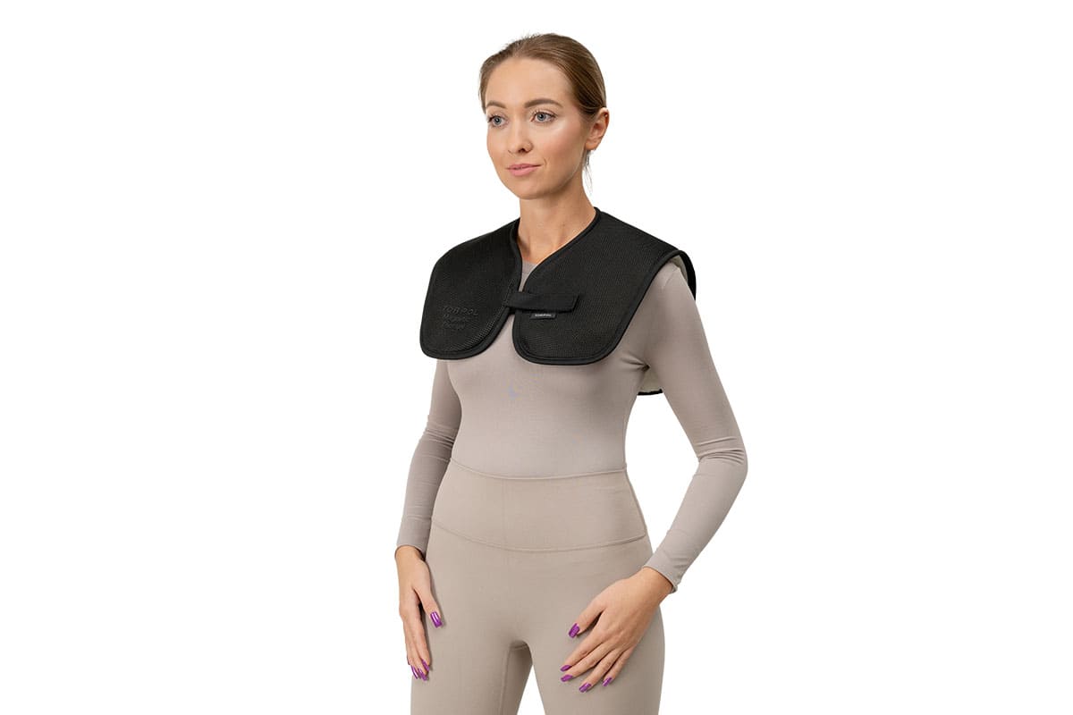 Recommended for ailments in the thoracic spine. Relieves rheumatic, arthritic, and post-traumatic pains as well as neuralgia and chronic pain of unknown origin. Used in rehabilitation, treatment and prevention of musculoskeletal disorders. Fastened on the chest with Velcro tape.