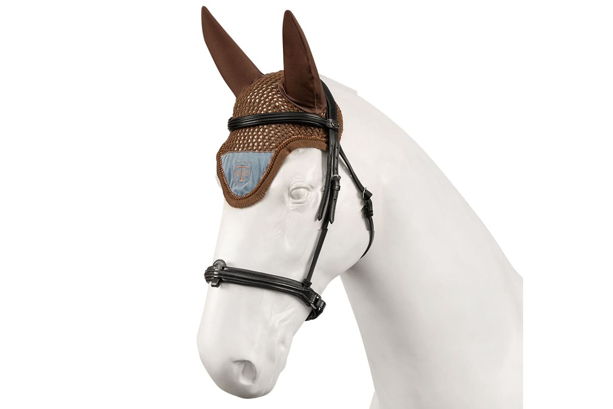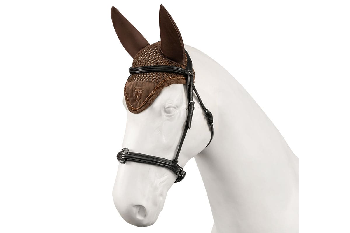 Made of soft yarn (OEKO-TEX® certified), finished with a decorative welt. Decorated with a brown cord, rhinestones and a velvet patch with Torpol embroidery. Resistant to pilling and stretching. Perfectly fitted to the horse’s head. Protect against insects and reduce noise while riding.