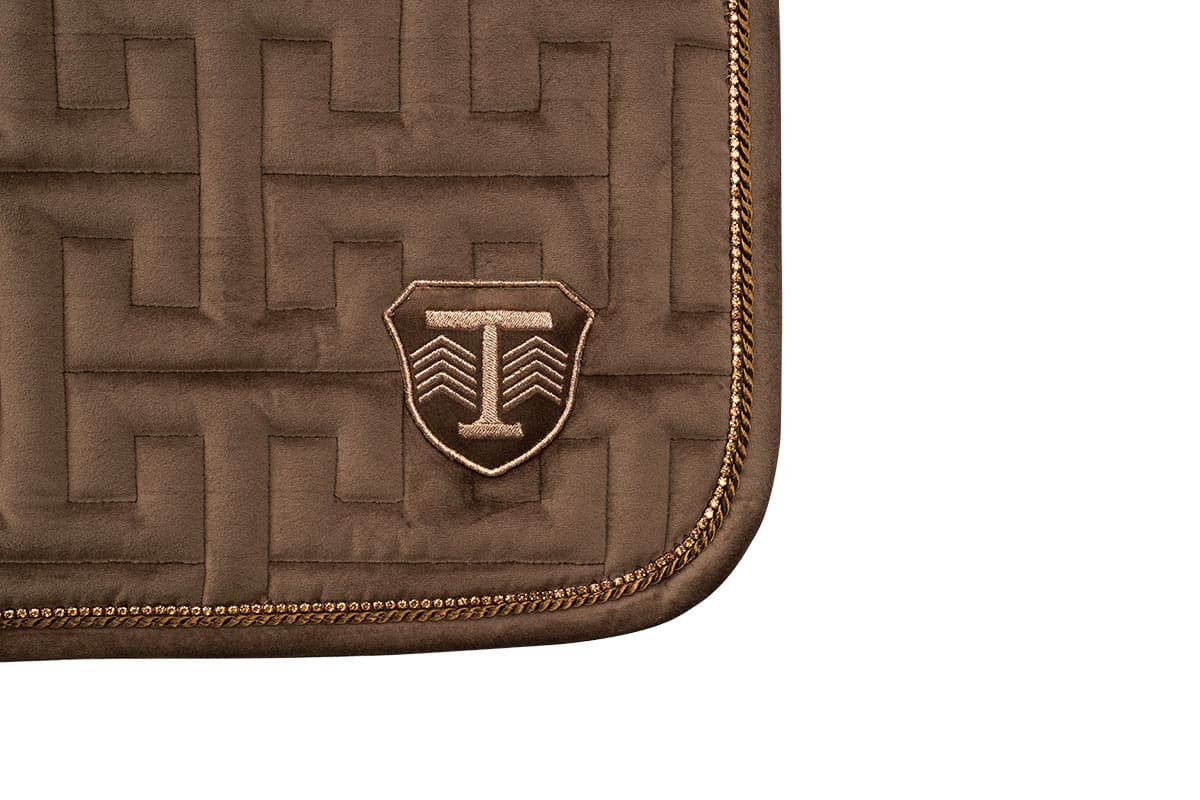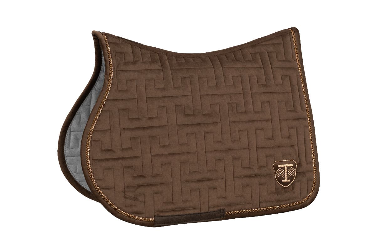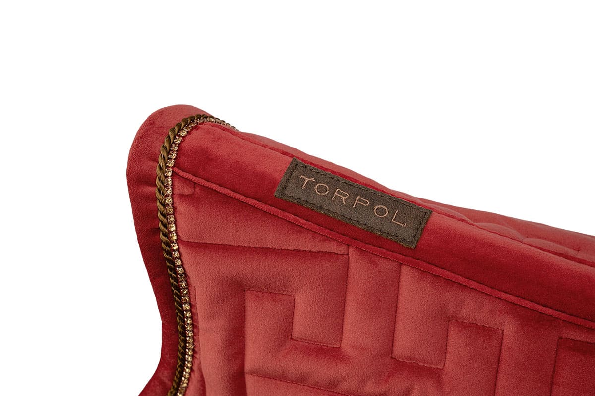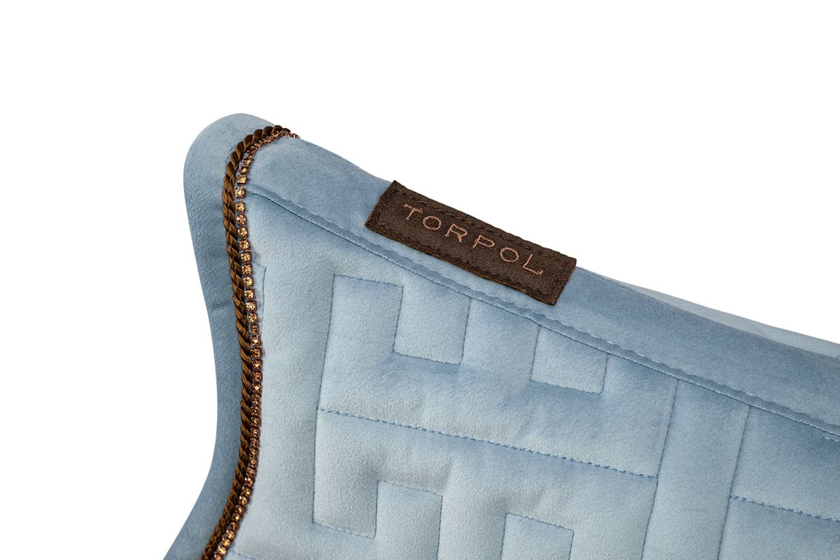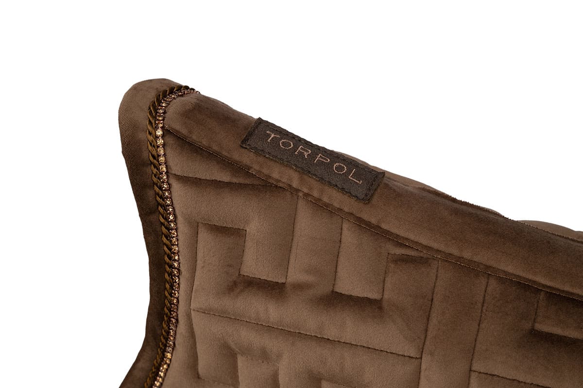 An original, proprietary quilting referring to the logo that signifies the Torpol brand. Finished with velvet piping, decorated with a brown cord, rhinestones and the Torpol crest on both sides. Perfectly fits the horse’s back.